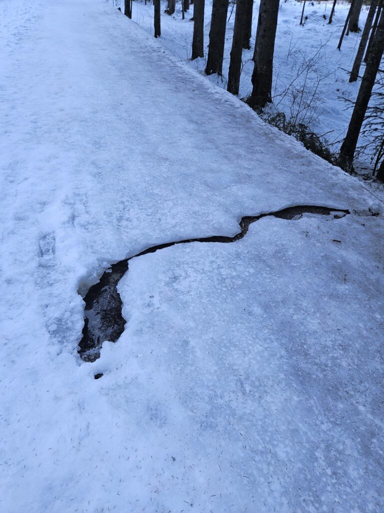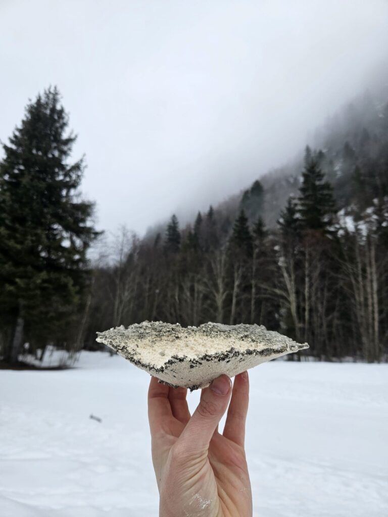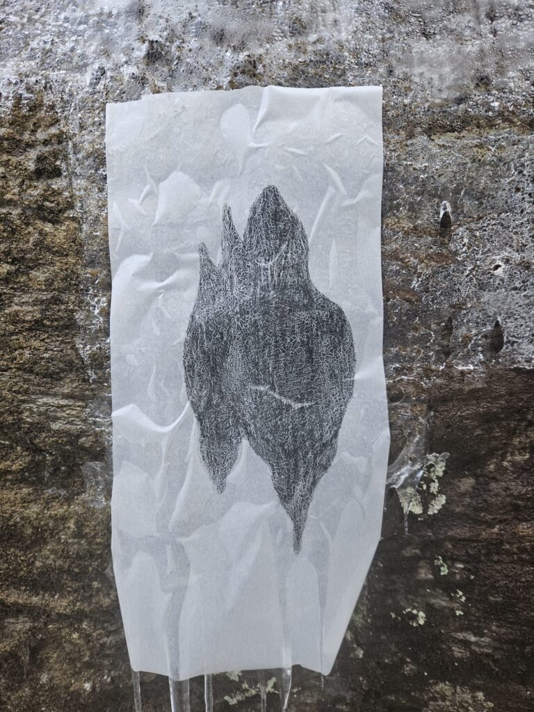 Durant cette résidence, je marche, j’observe les changements, je scrute l’éphémère. Je repère des lieux, des mouvements à accompagner. La montagne devient mon atelier ; l’eau, ma matière ; le froid, mon outil ; l’hiver, mon inspiration. J’emporte des fragments de saison, prélevés au moment où ils se défont.