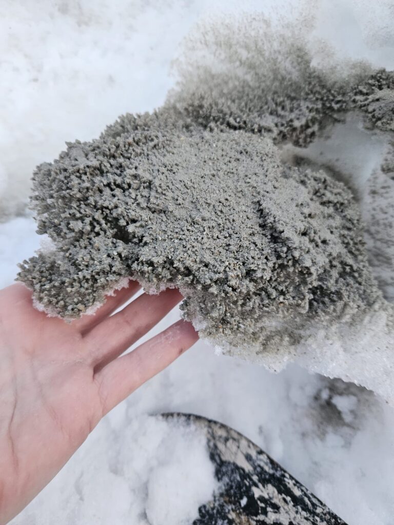 Au cœur du territoire alpin, je poursuis une recherche dédiée aux dernières traces de l’hiver, issues de la montagne en métamorphose que le temps emporte et qui glissent hors du paysage. Je travaille avec l’eau dans ses formes les plus fragiles : neige, glace, givre, stalactites. Chaque prélèvement saisit un instant où la matière se transforme, où l’hiver inscrit sa présence avant de se retirer.