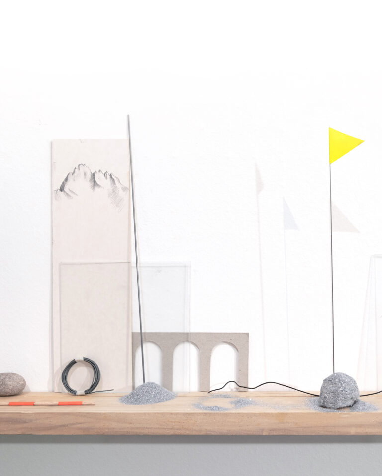 dessins, maquettes, lampes, plantes et matériaux bruts, créant un œuvre globale qui s’apparente à un